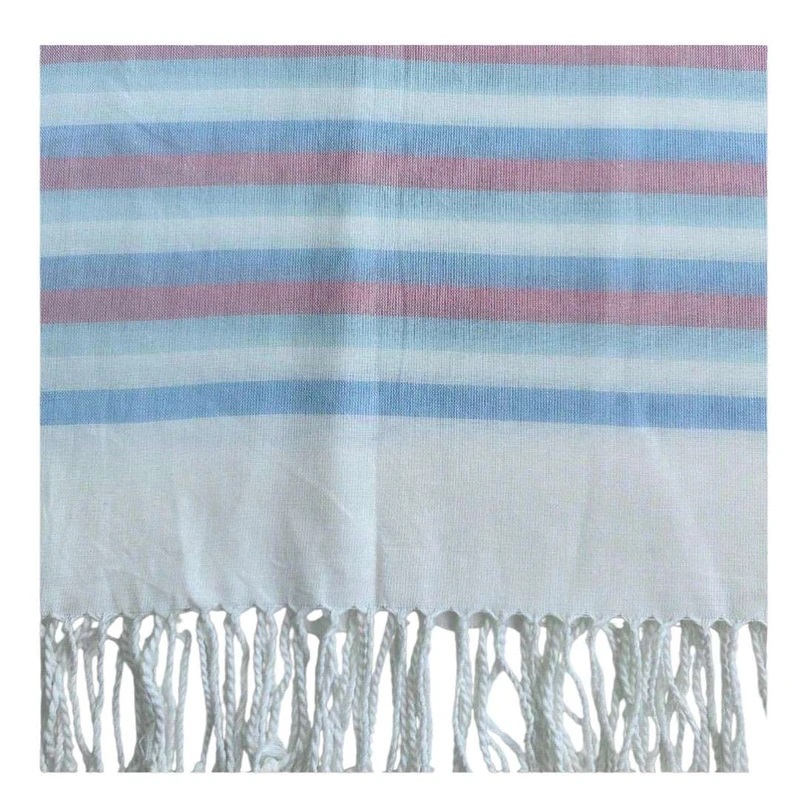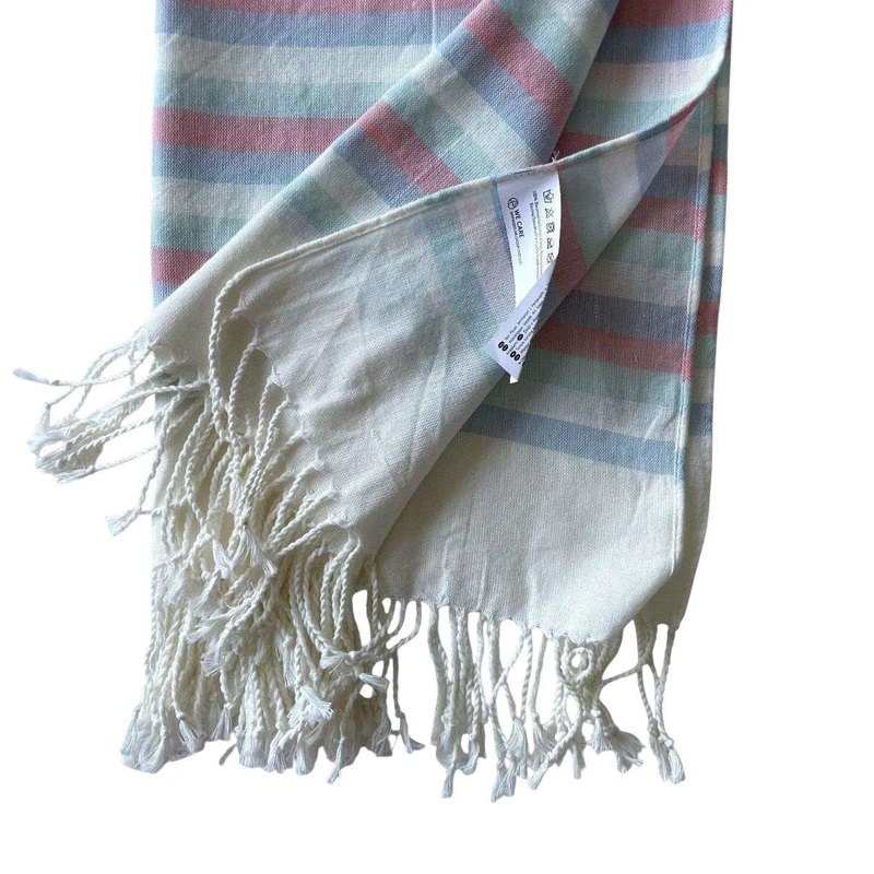 جزئیات زیبا: انتهای حوله با ریشهای سفید بافته شده تزئین شده که جلوهای سنتی و ساحلی به آن میبخشد.