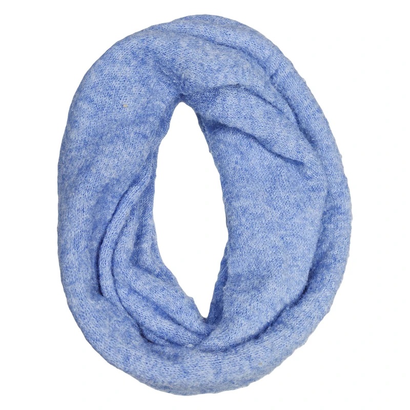 جنس و بافت: از الیاف بافتنی ضخیم و نرم با ظاهر ملانژ (ترکیب دو رنگ، در اینجا آبی روشن و سفید) تهیه شده که علاوه بر گرم بودن، حس لطافت و نرمی را به پوست شما منتقل میکند.