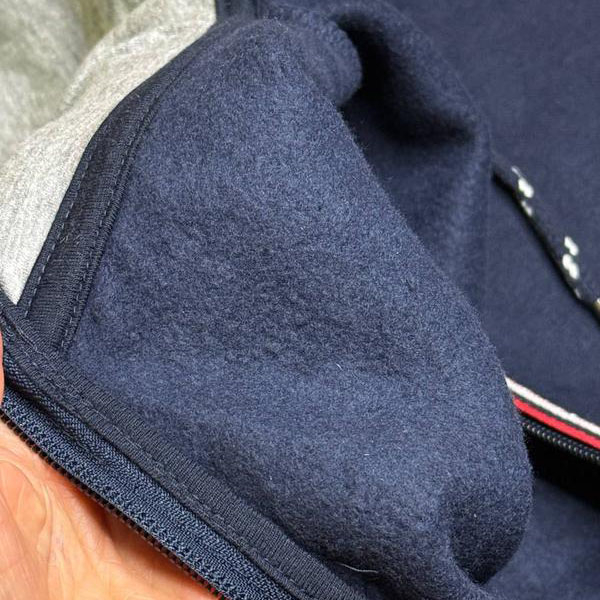 جزئیات زیپ: دارای زیپ سرتاسری روان با نوار تزئینی ظریف قرمز و سفید در لبهها که نشاندهنده دقت در طراحی است.