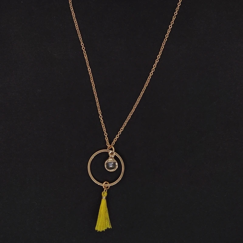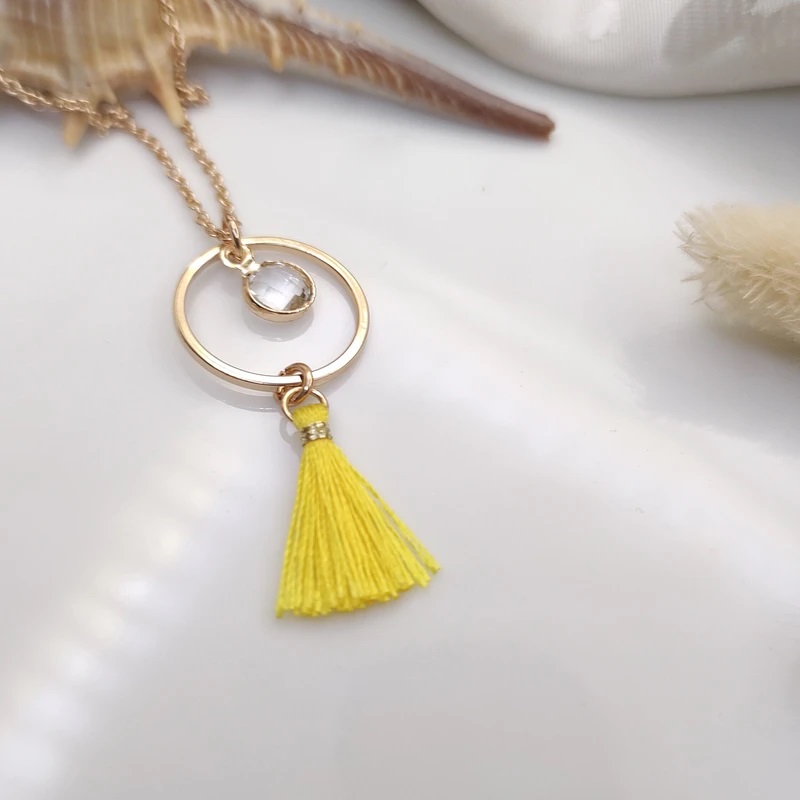 جزئیات منگولهای (Tassel): حضور یک منگوله نخی زرد رنگ و باطراوت در انتهای آویز، تضاد رنگی زیبایی با بدنه طلایی ایجاد کرده و جذابیت بصری آن را دوچندان میکند.