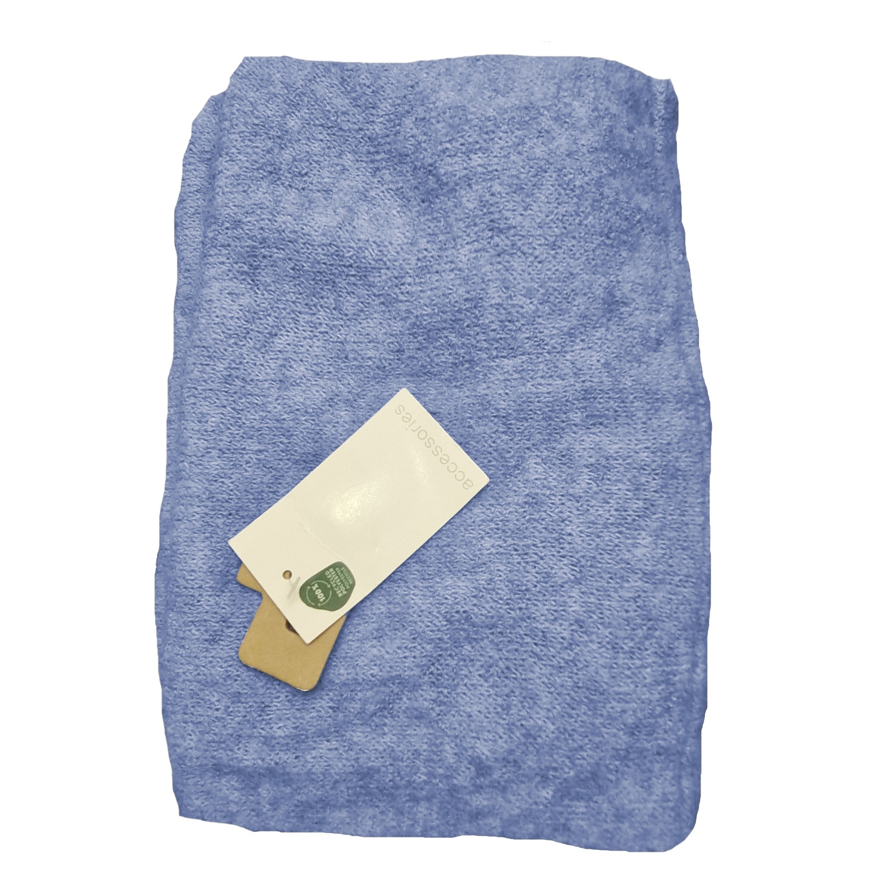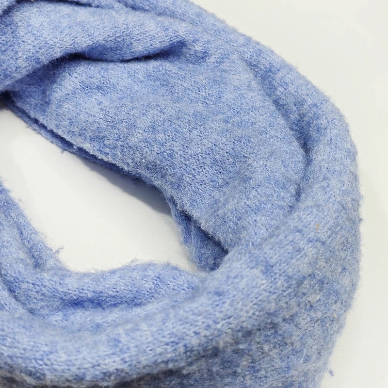 جنس و بافت: از الیاف بافتنی ضخیم و نرم با ظاهر ملانژ (ترکیب دو رنگ، در اینجا آبی روشن و سفید) تهیه شده که علاوه بر گرم بودن، حس لطافت و نرمی را به پوست شما منتقل میکند.