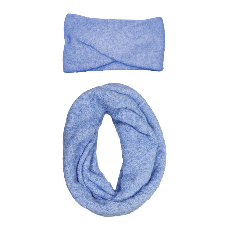 ست کامل: این محصول شامل یک شال گردن رینگی (Circular/Snood Scarf) است که به راحتی دور گردن پیچیده میشود و یک هدبند یا تل بافتنی که قسمت جلوی آن به صورت ضربدری گره خورده است.