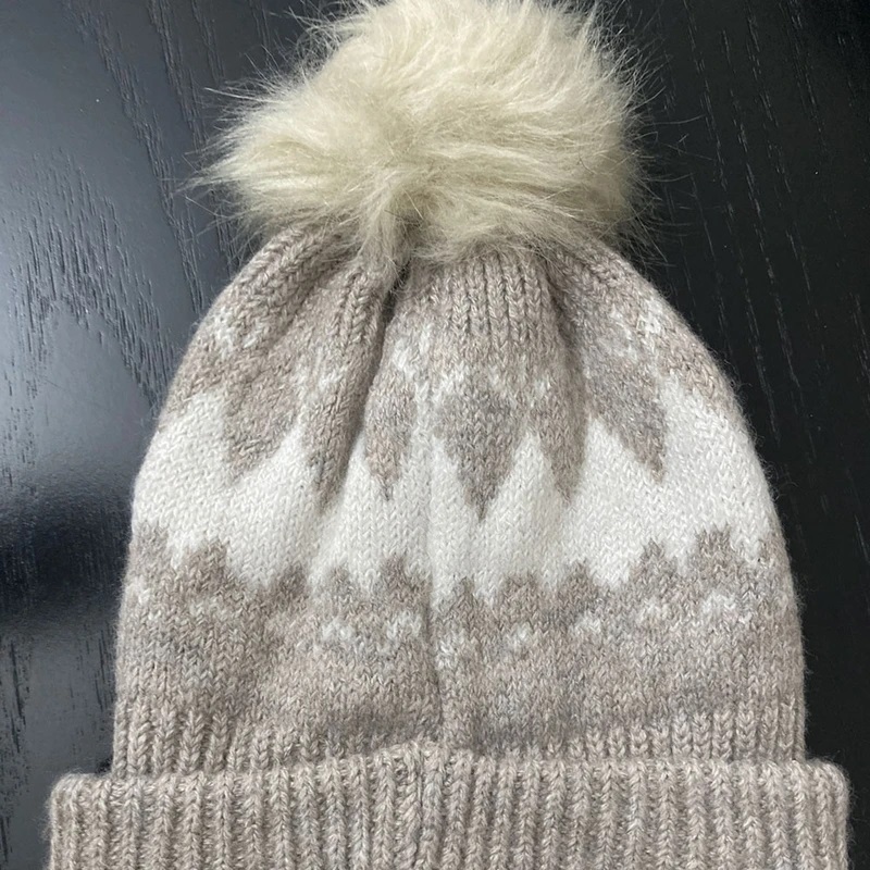 کلاه بافتنی پومدار برند I am – طرح برفی بژ و کرم